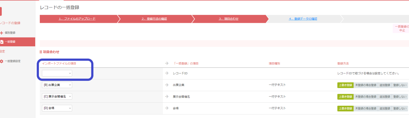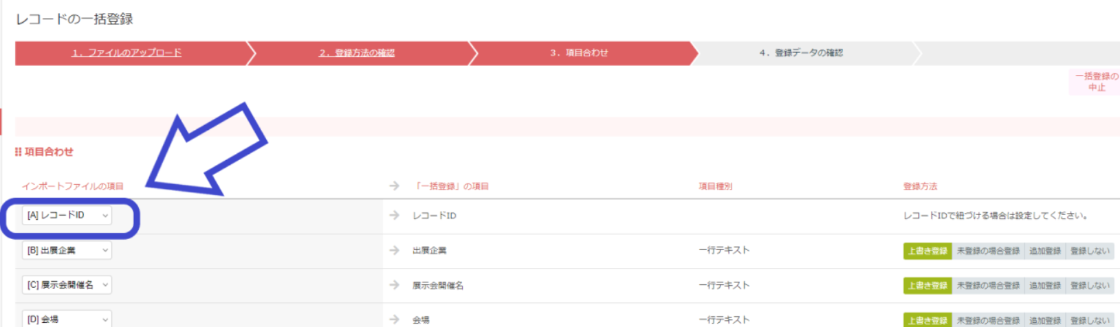 インポートファイルの項目にレコードIDが入っている事を、項目合わせのステップで確認します。