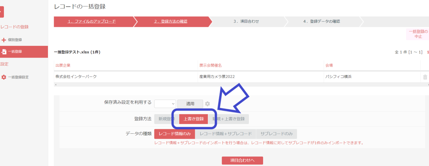 ※名寄せキー(レコードID)がブランクの状態で登録作業を進めると、名寄せが行えずインポート対象のデータが存在しないとみなされます。項目合わせに注意してください。