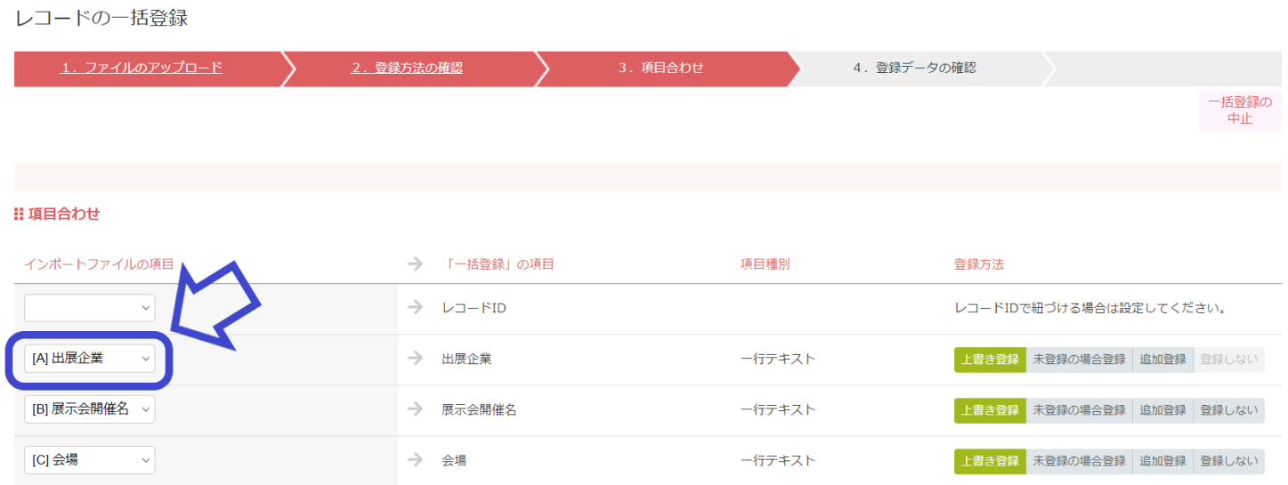 インポートファイルの項目に【重複チェック項目】(出展企業)が含まれているかどうかを、項目合わせのステップで確認します。