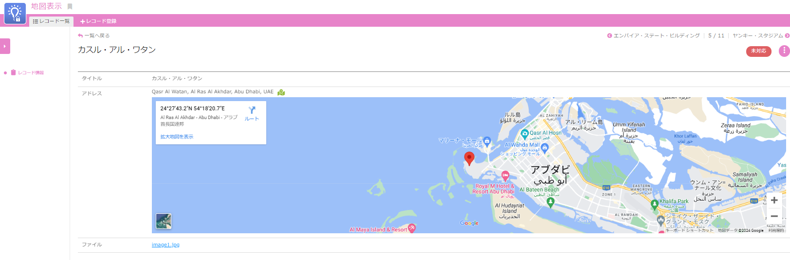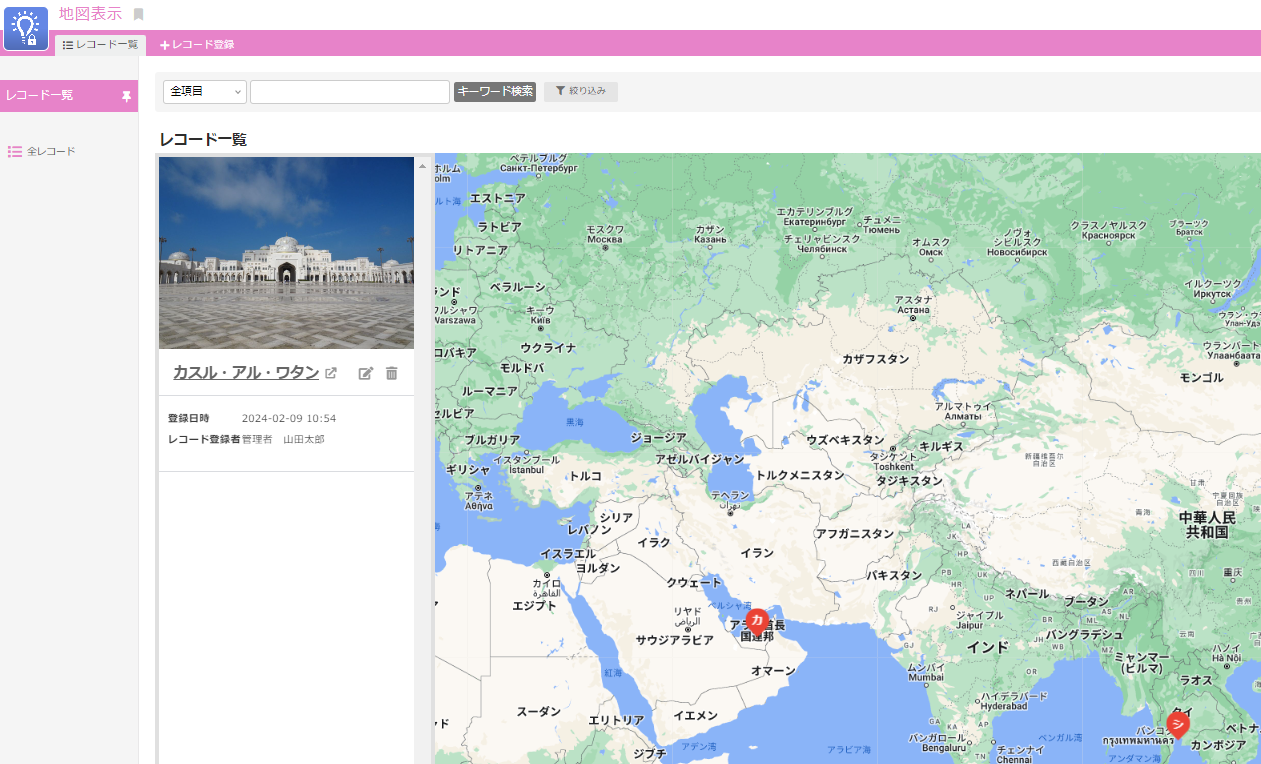 【地図表示】海外の住所の表示は可能ですか サポート担当 2024年11月26日 01:37 更新 海外の住所からも緯度経度を取得し、地図上に表示させることが可能です。 住所セット項目に、住所を入力▼ 緯度経度が取得され、約5分後に地図上に表示されます。 関連記事 レコードに登録した住所が地図上に反映されない 地図表示形式での表示方法 表示形式の切り替え(カレンダー表示・カンバン表示・地図表示・ガントチャート表示) レコードIDの情報は計算式に利用できますか