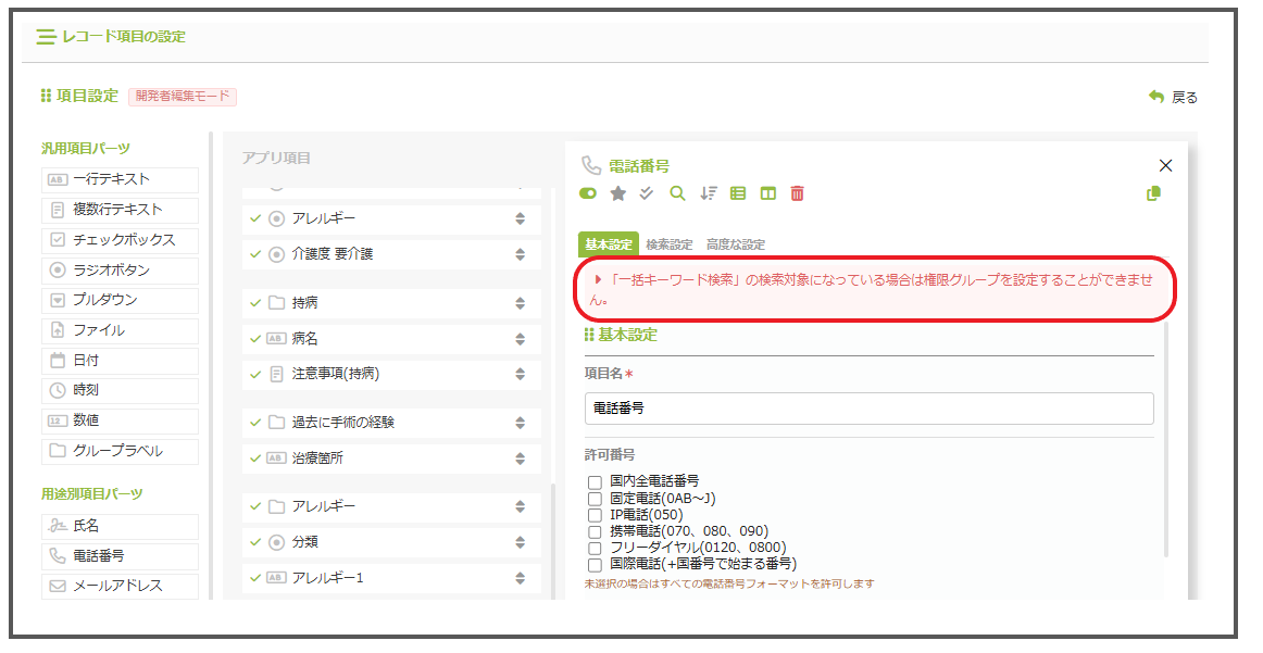 下図のアラートが表示され、権限グループが設定できない場合は「キーワード検索」の設定を変更することで設定が可能になります。