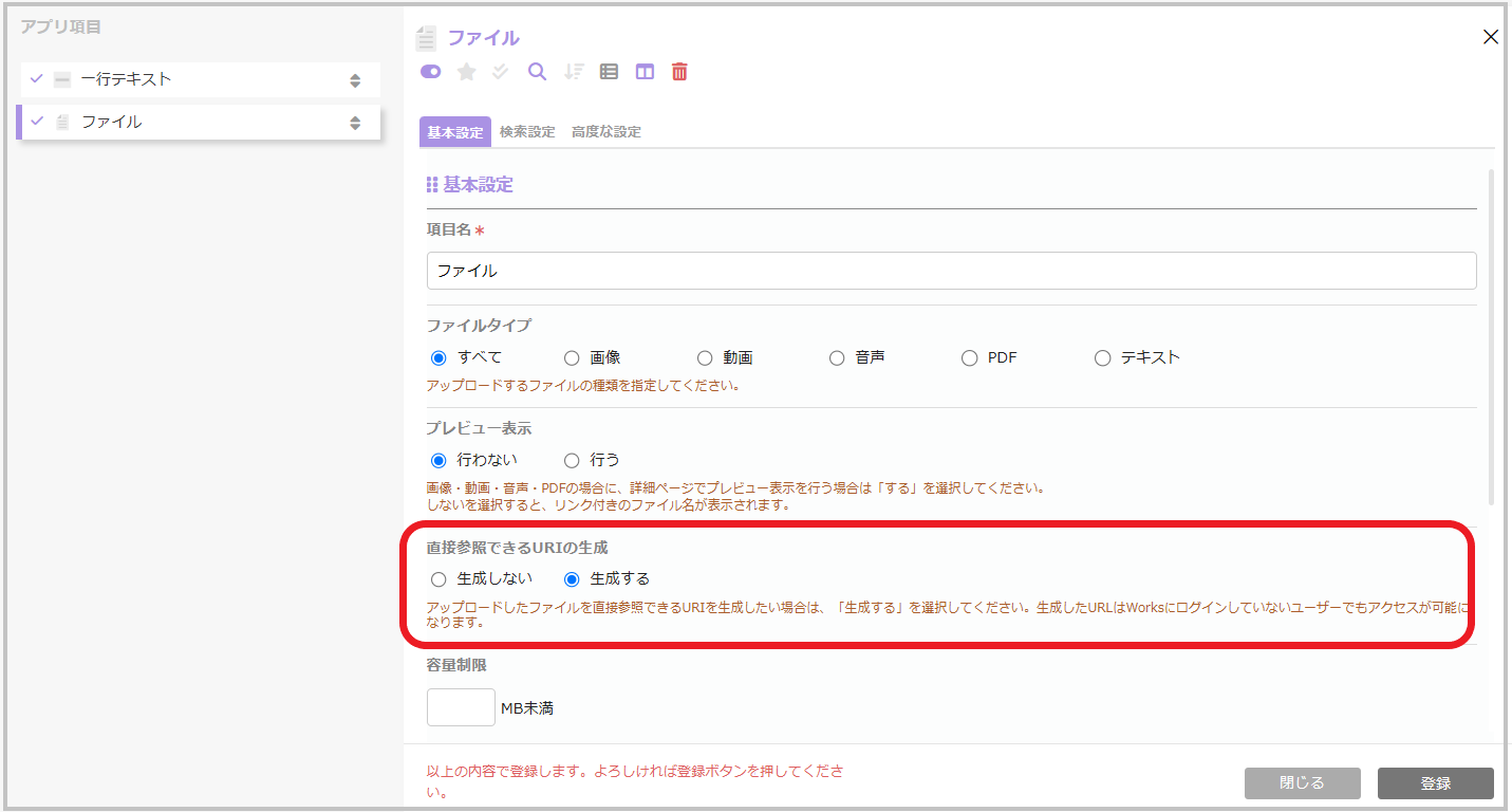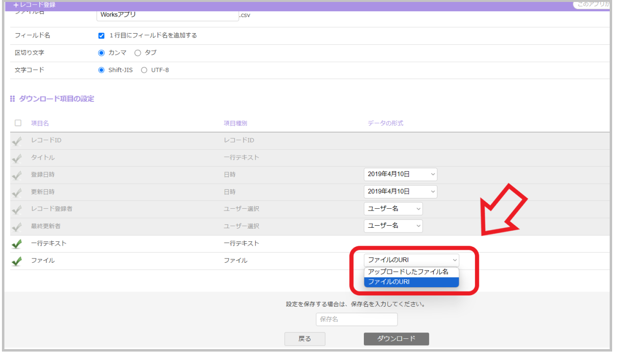 アプリに登録した画像をURIに変換してダウンロードすることはできますか サポート担当 2024年08月22日 04:34 更新 「直接参照できるURIの生成」機能をONにすることでCSVダウンロードが可能になります。 上記の設定が行われていると、CSVダウンロードの際に「ファイルのURI」をダウンロードする選択肢を選ぶことができます。 関連記事 ソート対象にならないレコード項目はありますか ダイレクトリンク機能 スマホアプリ(iOS/Android)で生体認証ログイン機能を使用する 画像の一括登録 条件分岐のキーを「参照項目」に設定すると、条件分岐の項目が表示されない