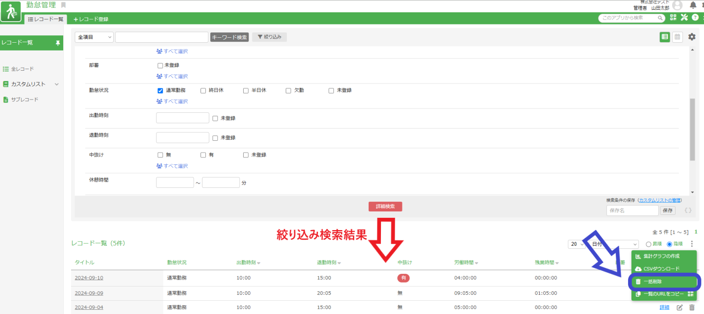 レコードを複数件同時に削除することはできますか サポート担当 2024年09月24日 10:29 更新 絞り込み検索結果から、一括削除を行うことで複数レコードを削除することが可能となります。 関連記事 メインレコード上に表示されているレコードの件数は、サブレコードの件数も含んでいますか レコード一括登録(CSV/Excelファイルのインポート) 自分が登録したレコードしか閲覧できないように制限をかけることはできますか アプリに登録した画像をURIに変換してダウンロードすることはできますか サスケWorksへのログイン